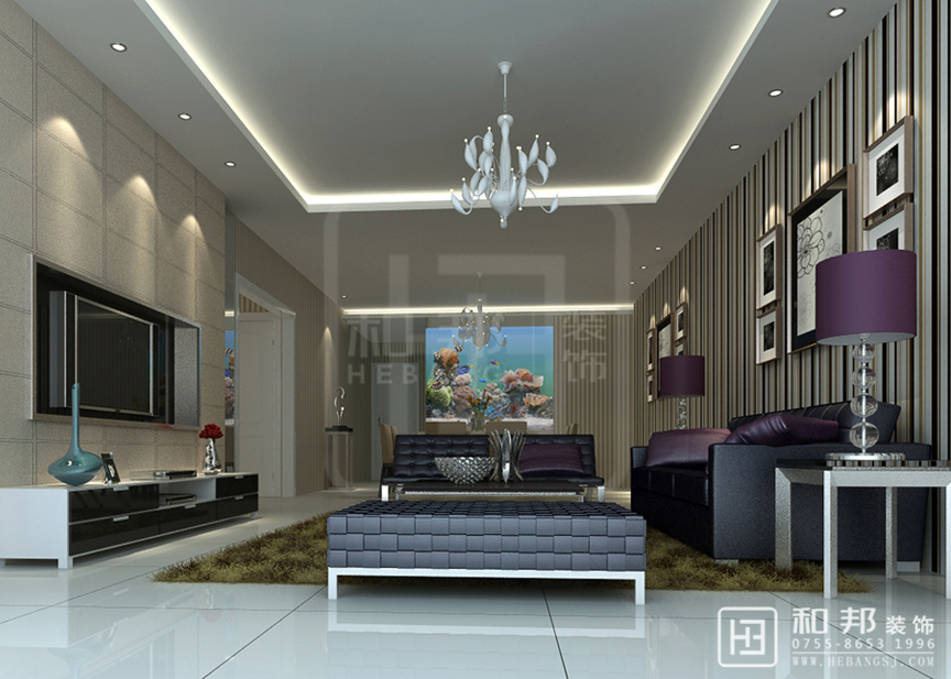 客廳的沙發墻面的線條與電視墻的墻面有著“天輕地重”的舒適視覺感,抱枕使用了紫色,與黑色沙發的相得益彰很舒適、溫和,這種裝飾效果形成對比的層次美感。