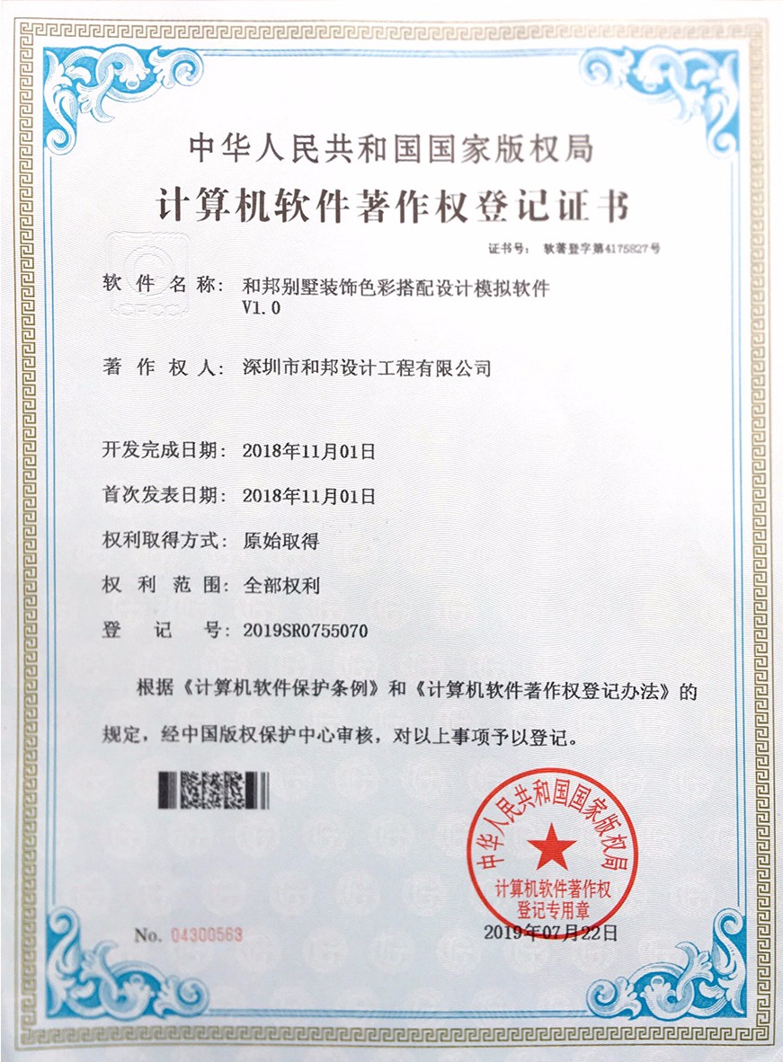 根據《中華人民共和國計算機軟件保護條例》和《計算機軟件著作權登記辦法》的規定,經中華人民共和國國家版權局審定,我公司自主研發的7款軟件被正式授予《中華人民共和國國家版權局計算機軟件著作權登記證書》,7款軟件分別為:“和邦別墅裝修效果智能優化系統V1.0”、“和邦室內辦公環境空間模擬規劃系統軟件V1.0”、“和邦別墅裝飾色彩搭配設計模擬軟件V1.0”、“和邦室內裝修效果3D模擬系統軟件V1.0”、“和邦精裝樣板房設計三維模擬系統V1.0”、“和邦別墅室內采光效果智能分析系統V1.0”、“和邦園林式別墅格局規劃設計系統軟件V1.0”。